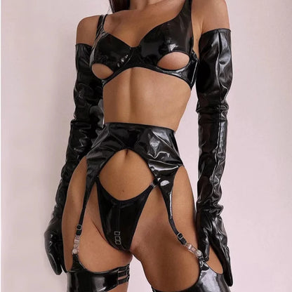 Ensemble de sous-vêtements sensuels en PVC, sans censure. Inclus: soutien-gorge push-up, jarretières, porte-jarretelles et culotte string. Les bonnets du soutien-gorge sont coupés pour révéler le bas de vos beaux seins. Gants non-compris.
